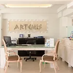 A szobákban tornác és erkély vasaló eszközökkel és klímaberendezéssel, valamint ingyenes Wi-Fi és síkképernyős műholdas TV biztosított. Egyes szobák elektromos vízforralóval, hűtővel és sütővel felszereltek. A fürdőszobák külön WC-vel és zuhanyzóval, valamint olyan kényelmi szolgáltatásokkal vannak felszerelve, mint a hajszárító és fürdőlepedők. Ezekből a szobákból a Herszonisszosz városi Artemis Hotel kilátást nyújt a medencére.